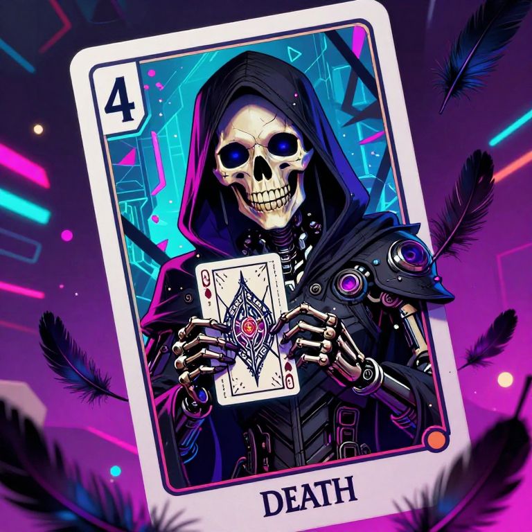 The image depicts a highly detailed and vibrant cyberpunk-style Death tarot card, rendered in a futuristic, acid color palette. The central figure is a skeletal figure, dressed in a hooded cloak with intricate, mechanical details, evoking a sense of advanced technology and decay. The skull is prominently featured, with a cold, calculating gaze, holding a card with a detailed, gothic design. The background is a chaotic mix of neon lights, geometric shapes, and floating feathers, creating a sense of depth and movement. The card is numbered \"4\" in a bold, futuristic font, adding to the cyberpunk aesthetic. The overall composition is dynamic, with elements interacting in a complex, visually engaging manner, reflecting the themes of death, technology, and the future.