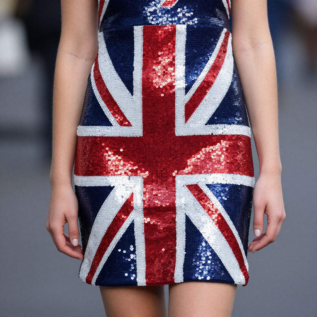 British Flag Sequin Dress, a woman in a dress with a union jack flag on it