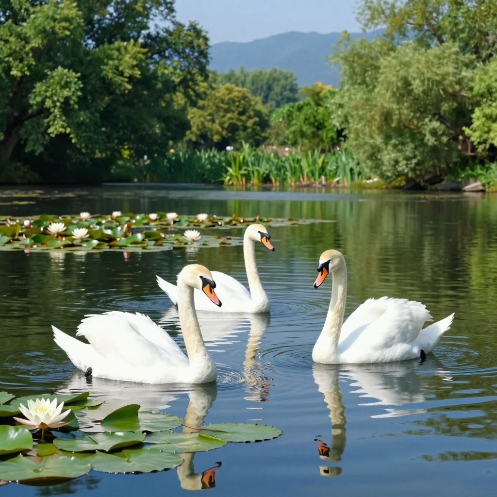 Four white swans gracefully swimming on a calm lake surrounded by lush green trees and lily pads. The clear blue water reflects the swans and surrounding foliage, with mountains faintly visible in the background. The peaceful scene is enhanced by blooming water lilies near the swans.