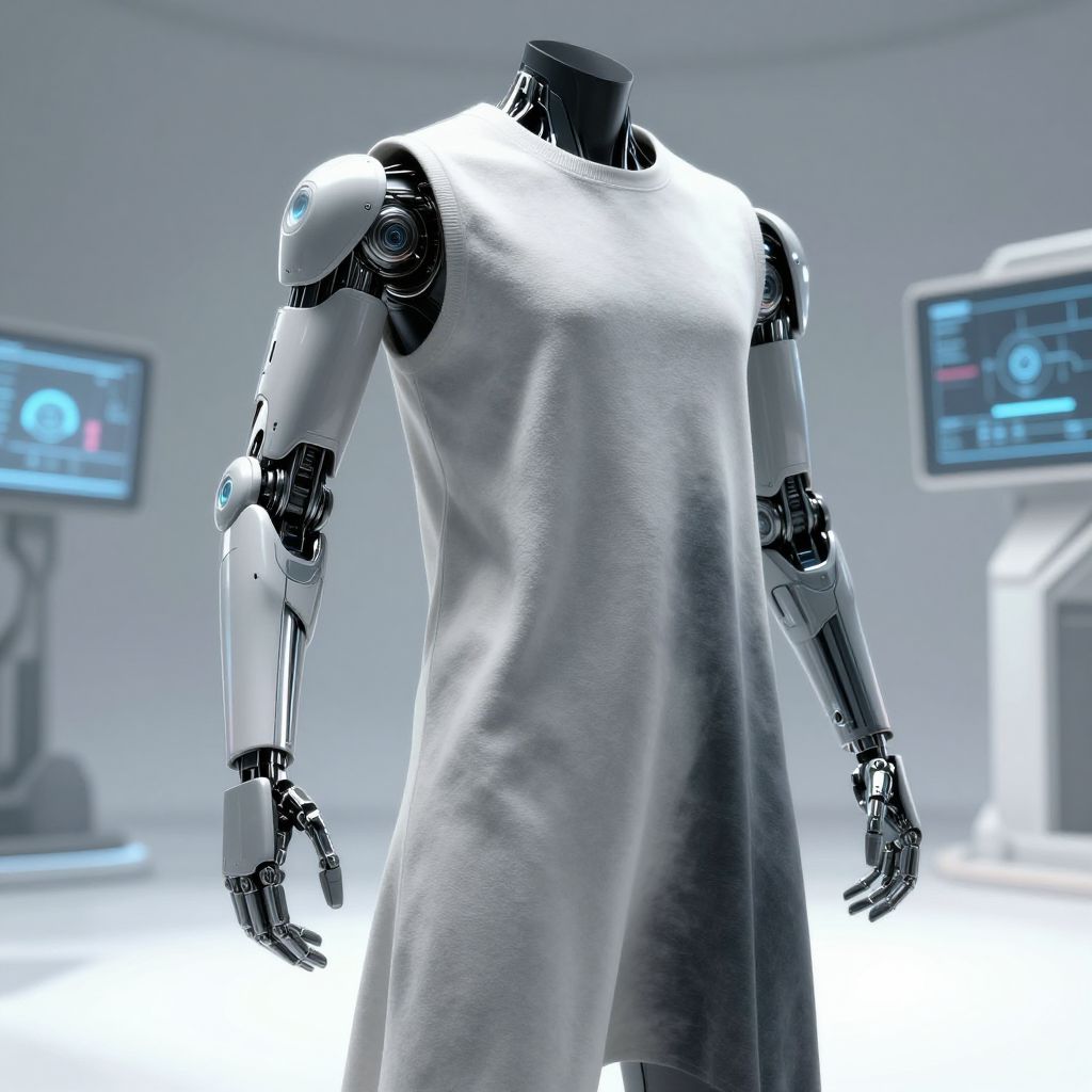 Ai cloths remover concept art, cybernetic character using advanced fabric removal technology, sleek robotic enhancements visible on arms, minimalistic tech environment with futuristic displays, dynamic lighting and shadows, futuristic clothing textures and materials, highly detailed sci-fi art