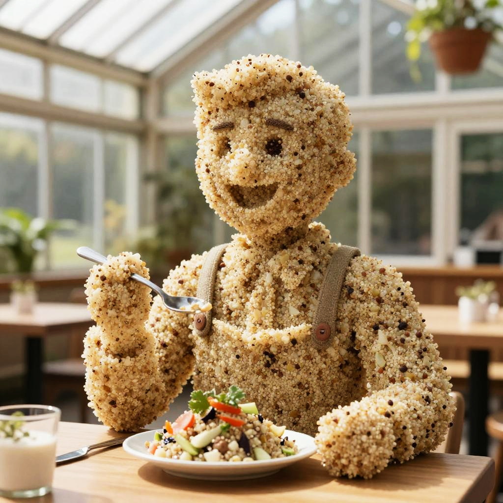 Pareidolia-inspired human sculpture of a restaurant patron made of stuffed bell pepper with a melancholic human face, cozy countryside inn setting, documentary style photography, warm ambient highlights