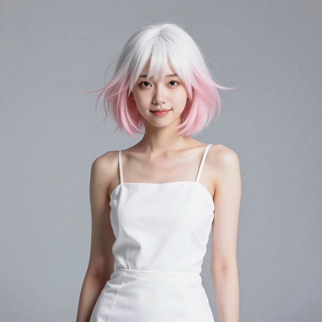 Portrait of a young Asian woman with shoulder-length white hair tinted with pink tips, wearing a white sleeveless dress. She stands against a plain gray background with a slight smile and tousled hair, embodying a minimalist futuristic style.