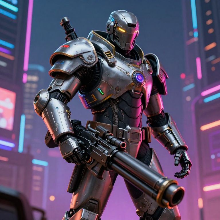 CGI sci-fi mecha soldier with metallic armor, glowing neon accents, holding a large gun, standing in a neon-lit futuristic cityscape.