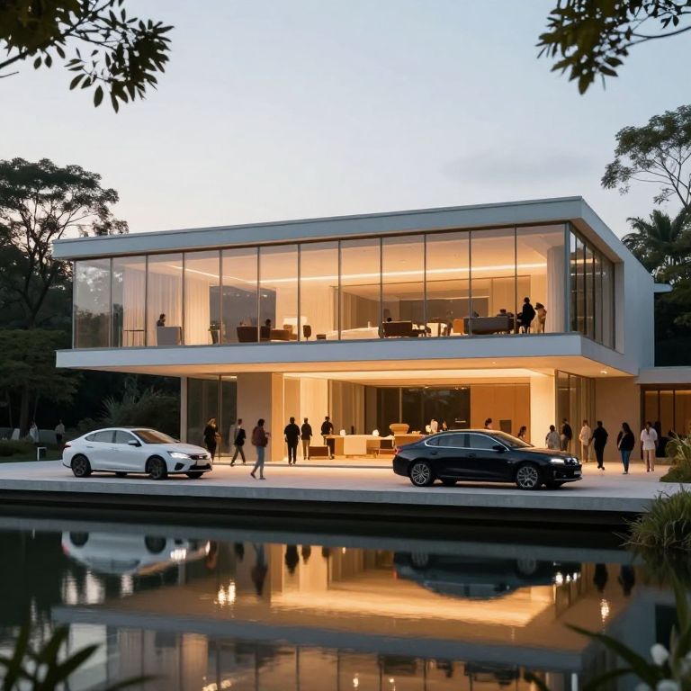 Photograph of a modern, two-story glass house at dusk. The house features large floor-to-ceiling windows on both levels, warmly illuminated from inside. A group of people, dressed in casual to semi-formal attire, stands and walks on the illuminated, white concrete terrace. Two cars, a white sedan and a black sedan, are parked in front of the house. A calm, reflective water body is in the foreground, bordered by dark green trees. The sky is transitioning from day to night with soft, fading light. The overall scene is sleek and contemporary, highlighting modern architectural design.