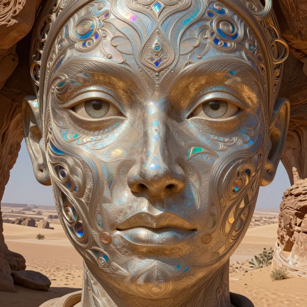 Photograph of an intricately designed, metallic silver face sculpture with a serene expression. The sculpture features detailed, swirling patterns and embedded blue and orange gemstones, reflecting light. The face has large, almond-shaped eyes with a slight upward tilt, and a smooth, rounded nose. The background shows a sunlit desert landscape with sandy dunes, sparse vegetation, and rocky formations. The sculpture is centered, with the desert stretching out behind it, creating a stark contrast between the metallic texture and the natural surroundings.