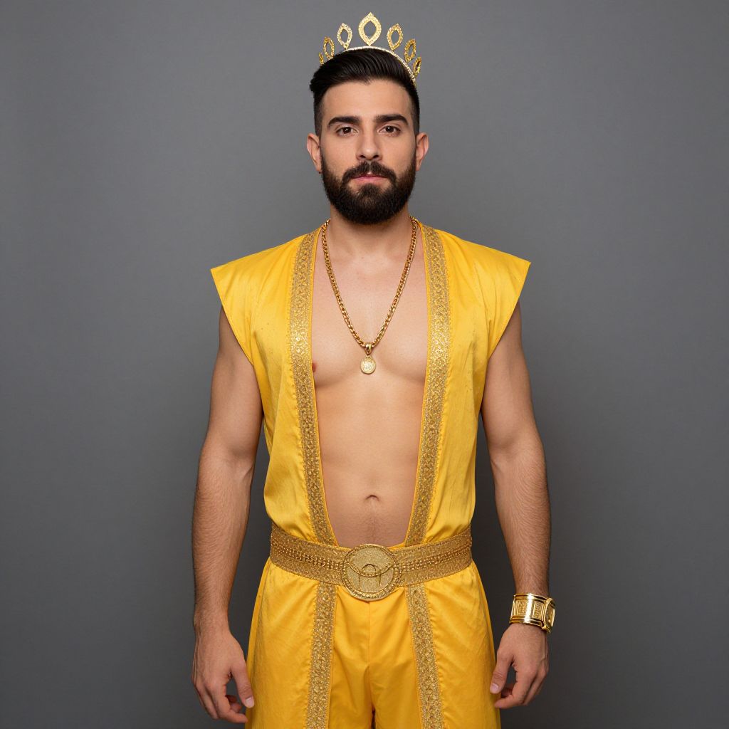 Photograph of a bearded man with dark hair wearing a golden crown, a sleeveless, deep V-neck, yellow satin robe with gold trim, and a matching gold belt with an ornate buckle. He also wears a gold necklace and a gold cuff bracelet on his right wrist. The robe exposes his chest and abdomen. The background is a solid, muted gray. The man stands straight, looking directly at the camera with a neutral expression. The lighting is even, highlighting the shiny texture of the satin robe and the metallic sheen of his accessories.
