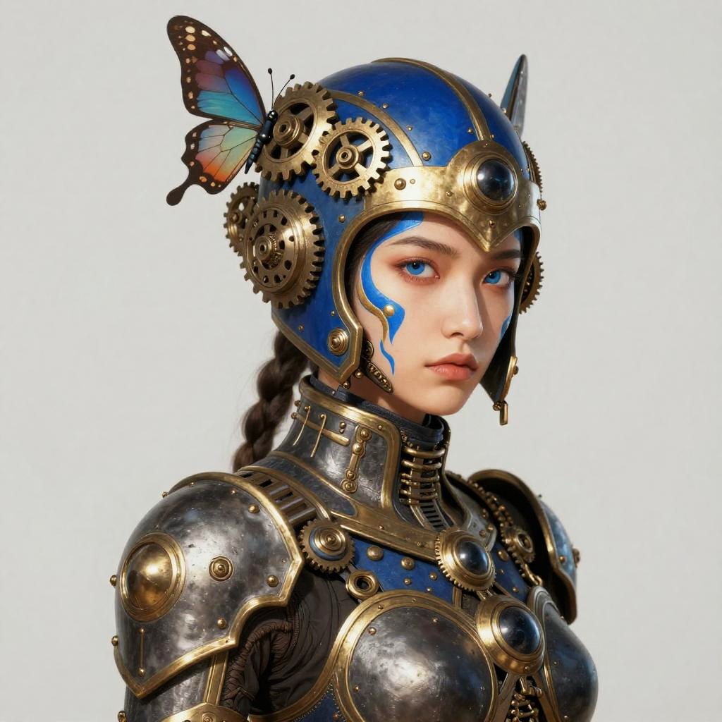 Digital artwork of a serene, androgynous figure with pale skin and calm expression, standing amidst fluffy white clouds. They wear an elaborate, gold crown with spiky rays, and a matching gold and bronze armor-like outfit adorned with large circular and spherical ornaments. The background is dark and vertical, enhancing the figure's ethereal presence. The overall style is surreal and regal.