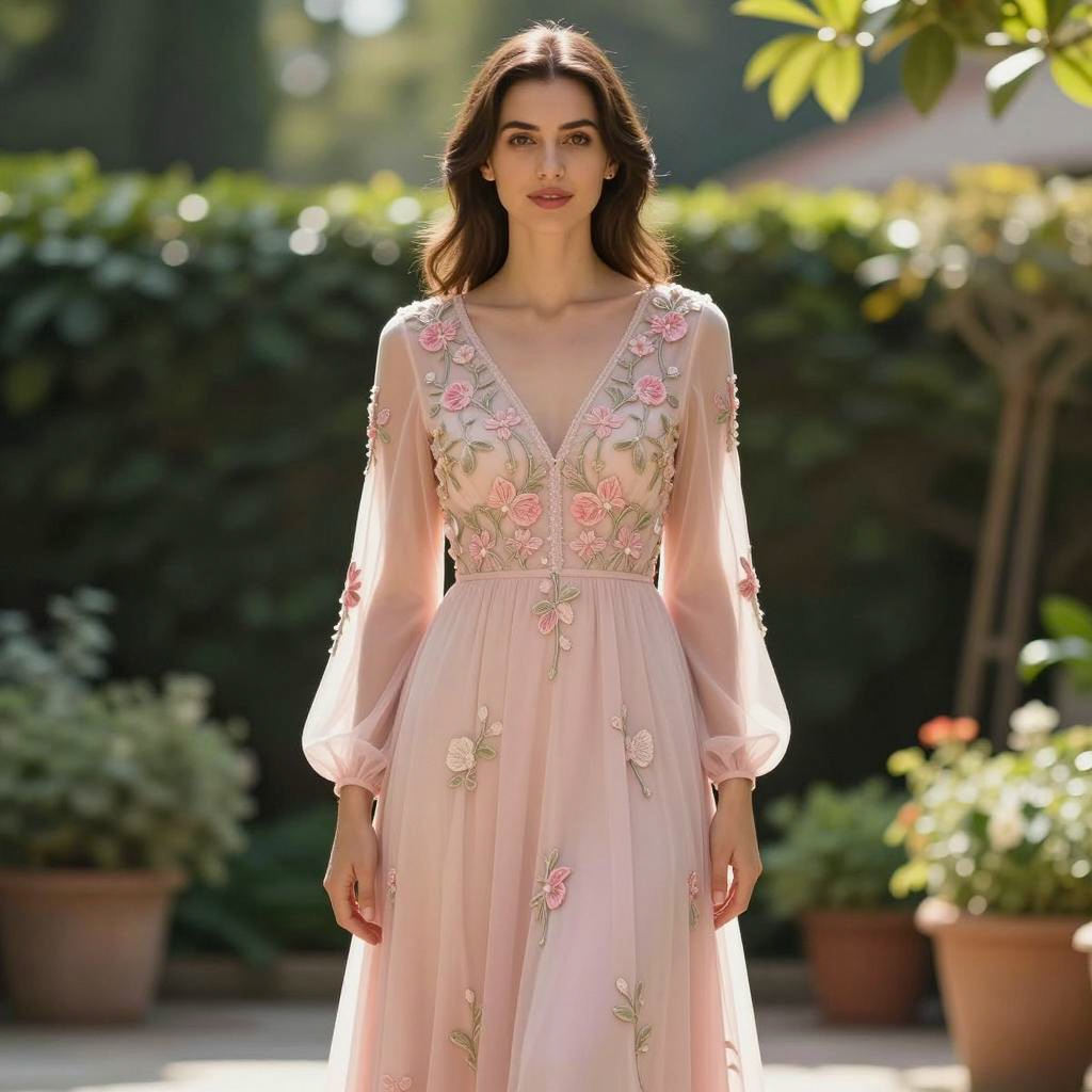 Engagement party dress long, photograph of a beautiful woman, long brown hair, fair skin, wearing a pale pink, long-sleeve dress with floral embroidery, standing in a garden, sunlight, blurred greenery and potted plants in the background, soft focus, elegant, daytime, realistic, portrait, natural light