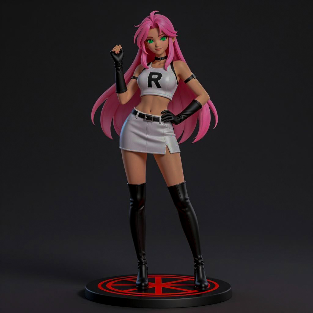 Digital figure of a pink-haired woman with green eyes, standing confidently. She wears a black, long, open coat with gold details on the sleeve, black pants, white crop top, and white lace-up boots. Hands in pockets. Background is solid gray. Base has a circular design with a small object. Figure has a neutral expression. Full-body, front view. One person. Visual style is realistic digital art.