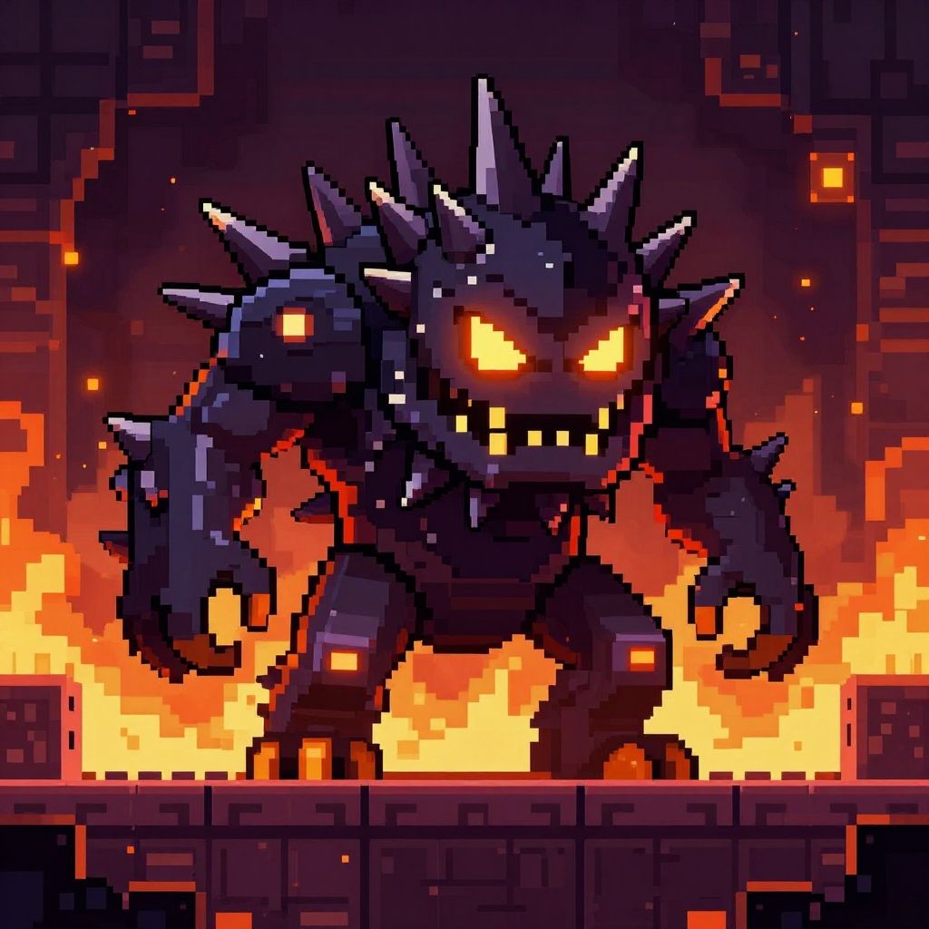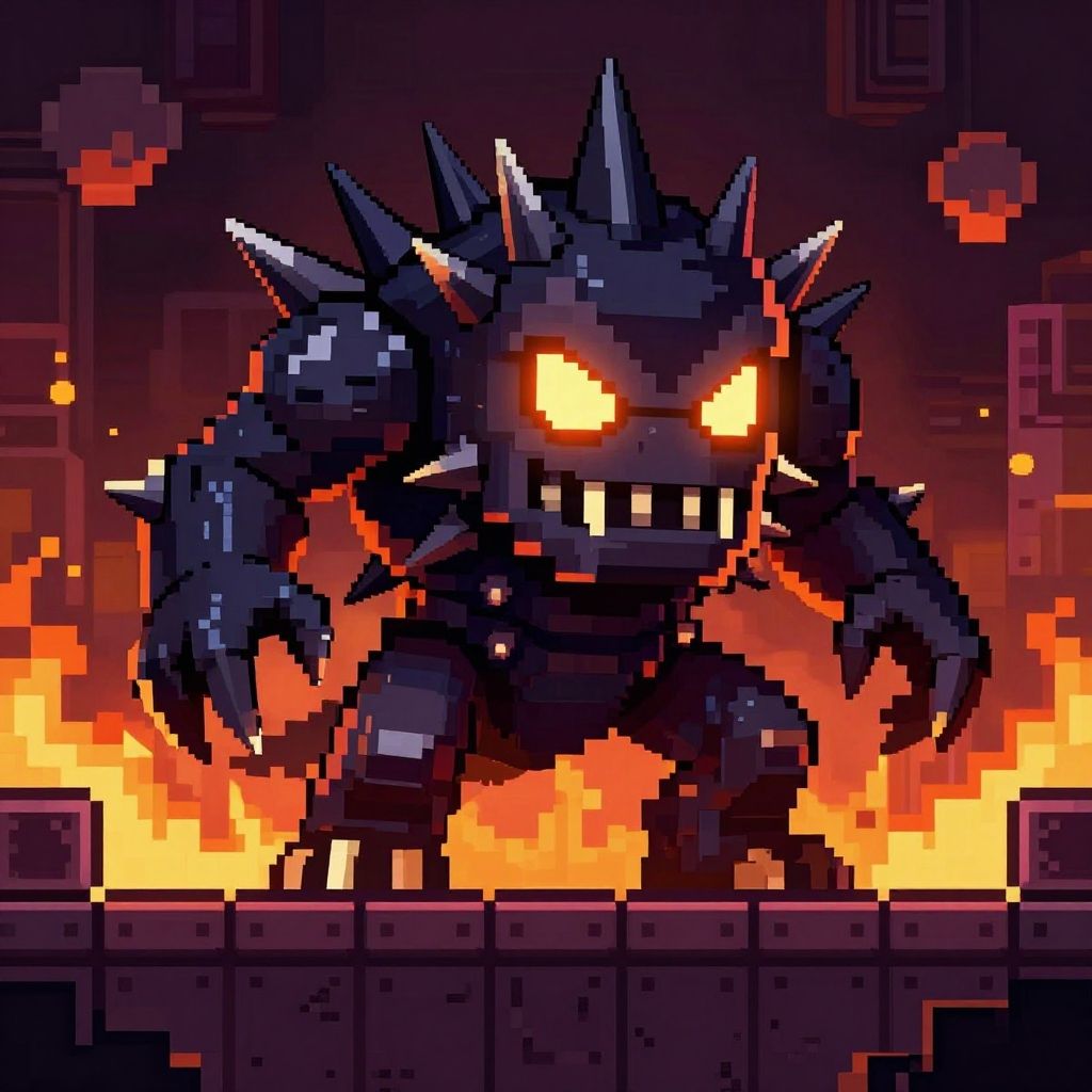 Spike pixel art boss fight, intimidating spiked creature in a pixel dungeon arena, glowing eyes, detailed pixel shading and highlights, dramatic atmosphere, pixel fire and smoke effects
