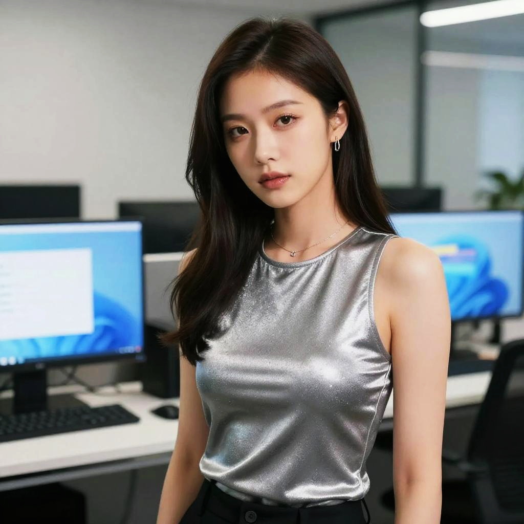 Photograph of an Asian woman with long black hair, wearing a shiny silver sleeveless top, standing in a modern office with multiple computer monitors in the