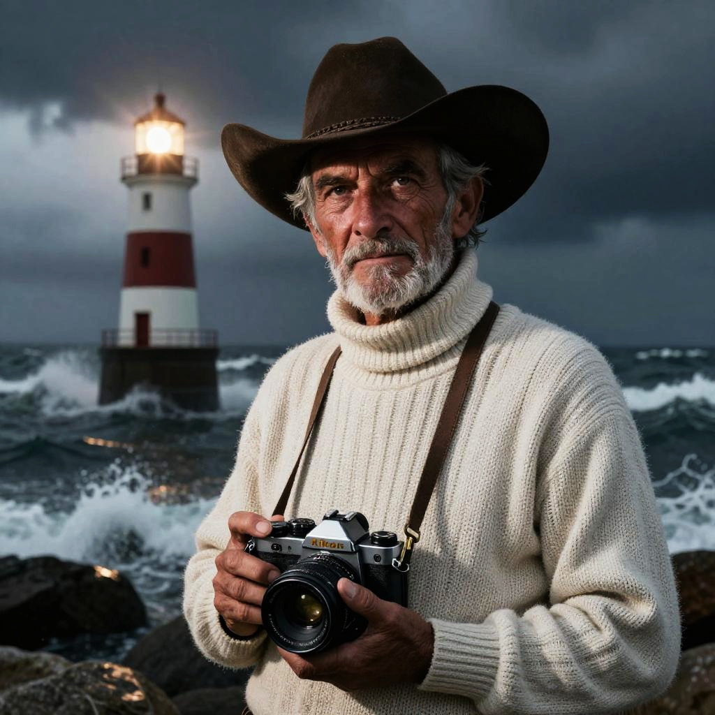 Dark, deep shadow, award winning portrait photo of a rugged (old fisherman:1.3), (face focus:1.5), (storm:1.2), (waves:1.3), ocean, (lighthouse background:1.5), (cowboy shot:1.4), (white turtleneck knitted sweater:1.3), looking at viewer, realistic, masterpiece, highest quality, backlighting, (lens flare:1.1), (bloom:1.1), (chromatic aberration:1.1), by Jeremy Lipking, by Antonio J. Manzanedo, by lee jeffries nikon d850 film stock photograph 4 kodak portra 400 camera f1.6 lens rich colors hyper realistic lifelike texture dramatic lighting unrealengine trending on artstation cinestill 800