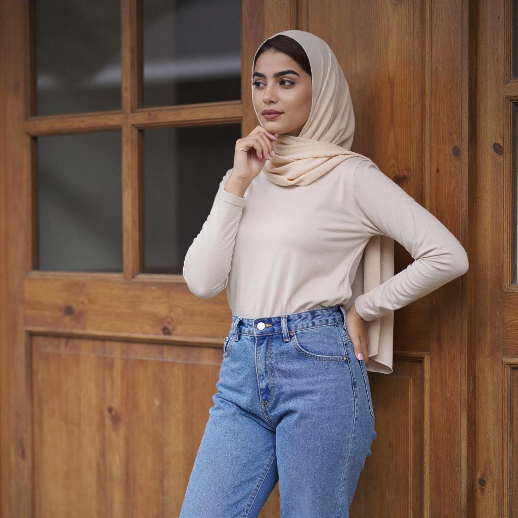 Photograph of a young woman with light skin and dark eyes, wearing a black hijab, black ribbed long-sleeve top, and black jeans. She stands in a side profile, looking over her shoulder with a slight smile. Background includes a white building with large windows and greenery.