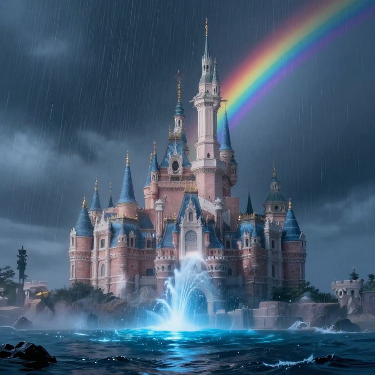 This digital painting depicts a majestic, multi-turreted castle illuminated by bright white lights, standing on a rocky island surrounded by a turbulent, rain-laden sea. A vivid rainbow arcs across the stormy, dark blue sky. The castle has pink and blue turrets, with intricate details and golden accents. A powerful, luminous fountain shoots up from the base of the castle, creating a bright blue glow. Raindrops streak diagonally across the scene, adding a sense of motion and drama. The overall atmosphere is magical and enchanting, blending elements of fantasy and realism.