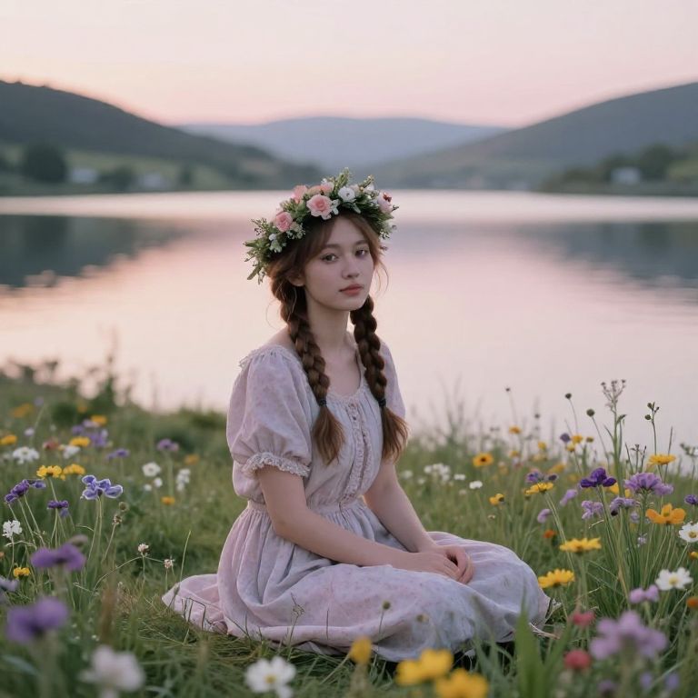Young Scottish lady with braided hair wearing a floral crown, sitting by a serene loch at sunrise, soft pastel colors, realistic style, surrounded by blooming wildflowers and rolling hills