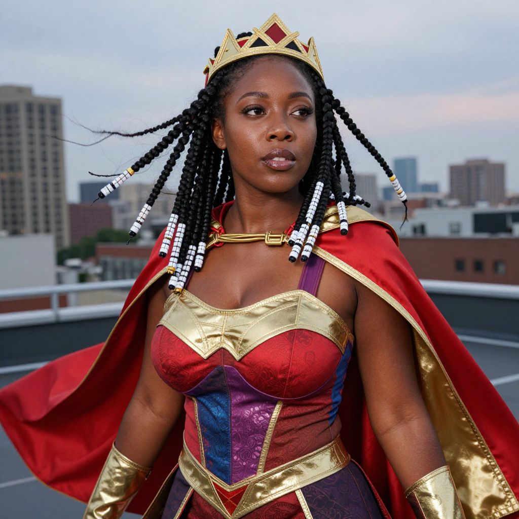A confident African American woman with a rich, textured natural hairdo braided into a bold, multi-strand Dutch braid with woven beads, dressed in a colorful superhero-style costume featuring a red and gold cape and a crown headpiece, posing on a rooftop in a fictional urban city at dusk, wind blowing her hair and the cape dynamically, realistic skin tone and facial expression showing pride and strength. The woman has big tits and cute face