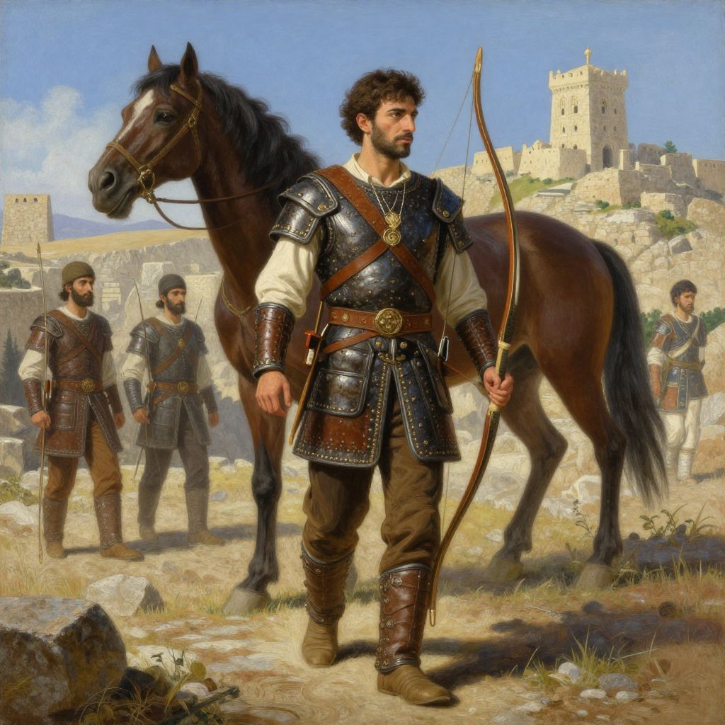 Portrait of masculine strong maronite lebanese archers, carrying bows, wearing medieval leather armor, walking on foot with the mount lebanon on background, hyperrealism, jodhpurs greg manchess, painting by sargent and leyendecker, ghibli studio, asymmetrical intricate elegant illustration hearthstone, by greg rutkowski, by greg tocchini, by craig mullins