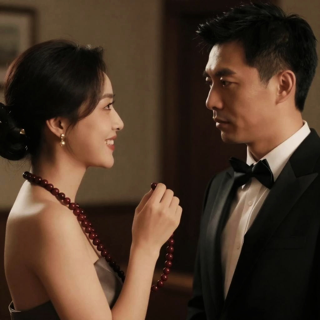 Black-and-white photograph of a man and woman in formal attire, facing each other. Woman with elaborate hairdo and flowers, man in suit, both smiling. Man's right hand gently holds woman's chin. Background blurred. Number of people: 2.