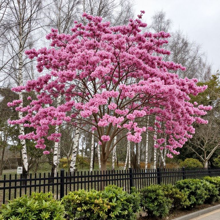 Blossoming Tabebuia tree with vibrant pink trumpet-shaped flowers stands prominently in a garden, surrounded by a black metal fence, green shrubs, and a backdrop of bare birch trees under a cloudy sky.