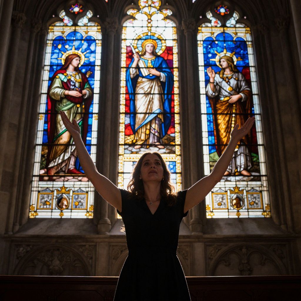 Sunlight streams through vibrant stained-glass windows, casting a luminous glow over a woman standing in a grand cathedral, her silhouette accentuated by the interplay of light and shadow as she raises her arms in a moment of reverent expression.