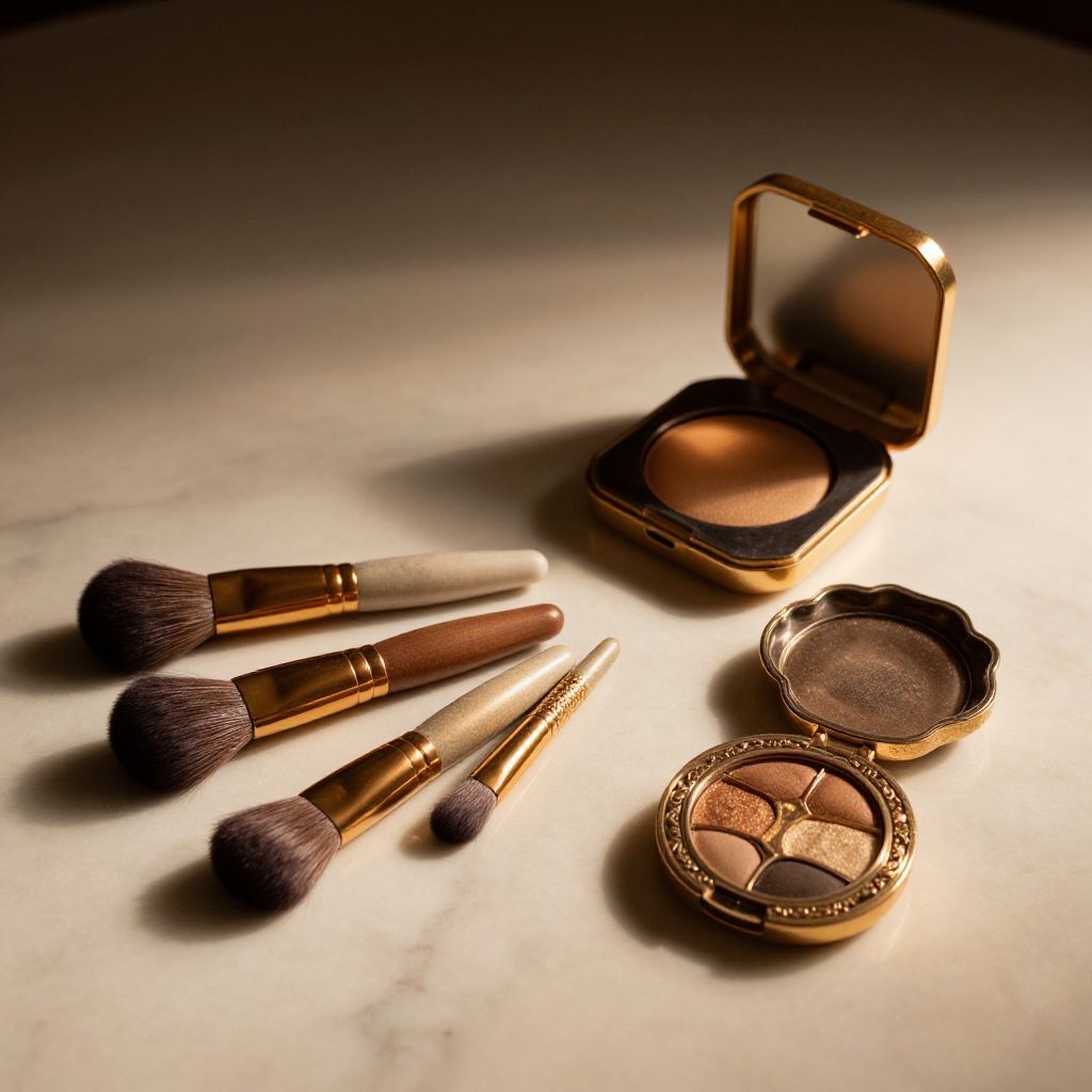 Photograph of gold-bronze makeup set: three brushes, open compact, and open eyeshadow pot on marble surface, illuminated with dramatic lighting