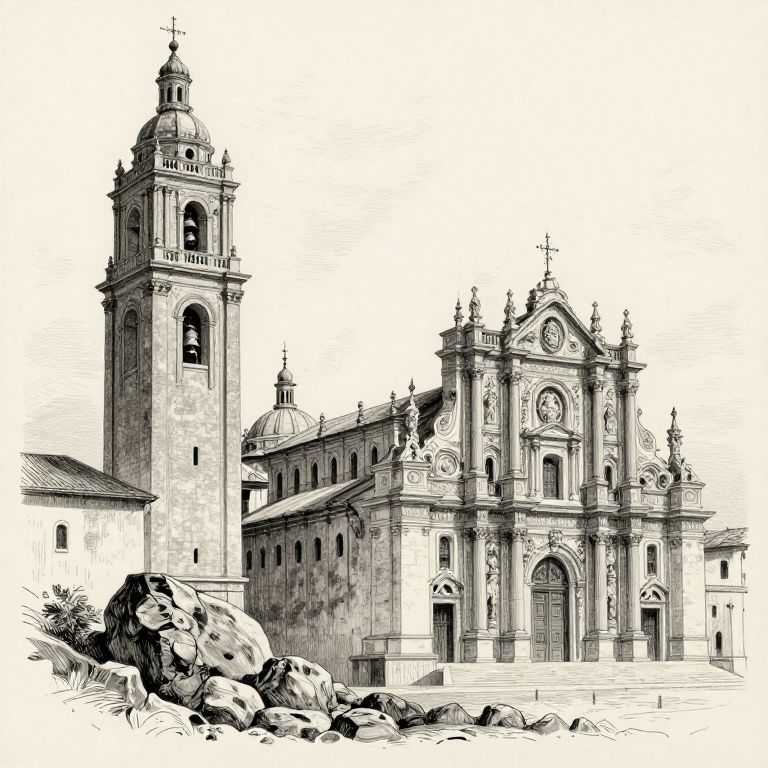 A detailed black-and-white sketch rendered in a vintage style depicts an ancient architectural ensemble featuring a tall bell tower and a grand cathedral with intricate columns and spires, set against a rocky landscape, evoking the timeless essence of historical European architecture.