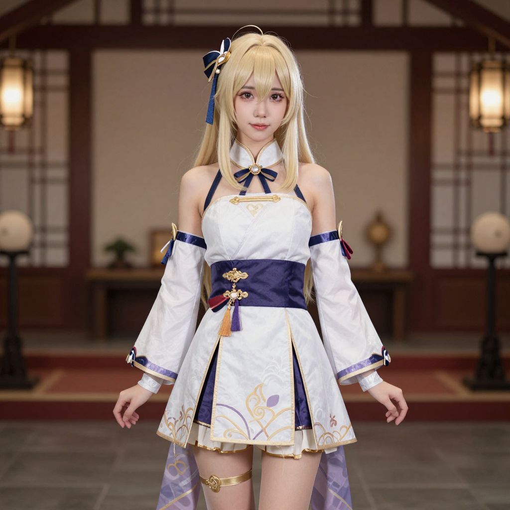 Anime-style digital artwork of a blonde girl in a white and navy blue, ornate, sleeveless dress with gold accents, standing in a traditional Japanese