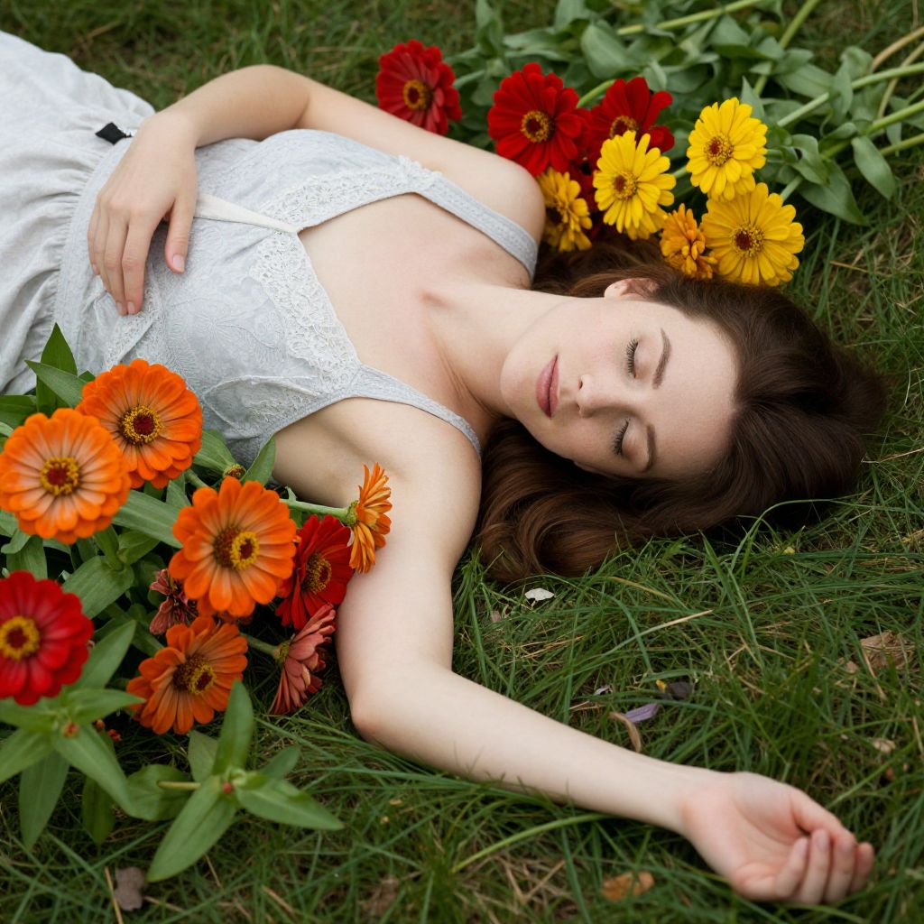 Photograph of a fair-skinned woman with long brown hair lying on green grass, surrounded by vibrant orange, red, and yellow flowers. She wears a white, lace-trimmed sleeveless dress and has her eyes closed with a serene expression. Her right arm is stretched above her head while her left arm rests on her abdomen. The flowers are scattered around her, with some touching her hair and shoulders. The grass is lush and the image has a natural, outdoor feel. The lighting is soft, emphasizing the calm and peaceful atmosphere.