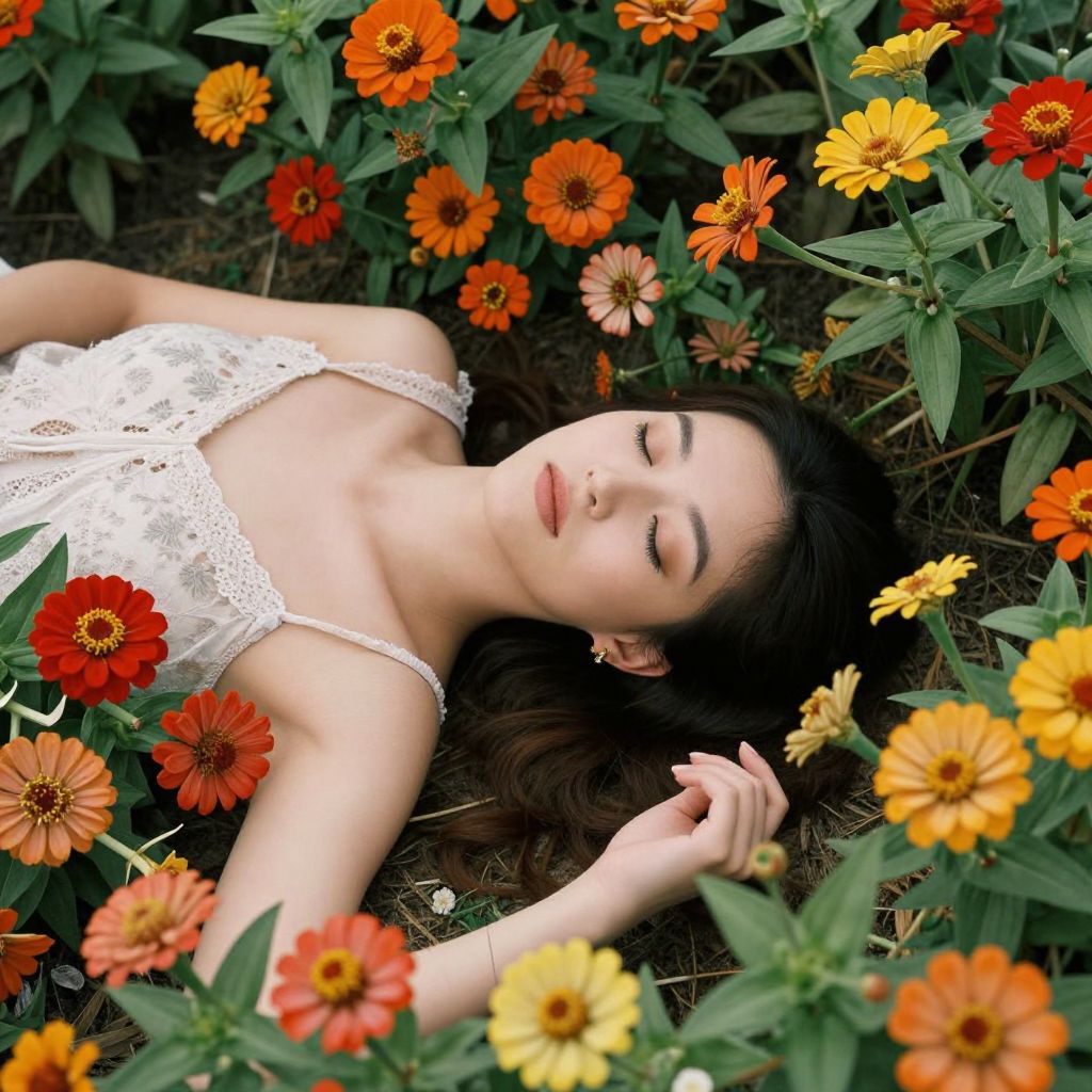 Woman lying gracefully amidst vibrant zinnia bouquets, her eyes closed in serene repose, surrounded by a lush array of orange, red, and yellow flowers, captured by Rob McClure.