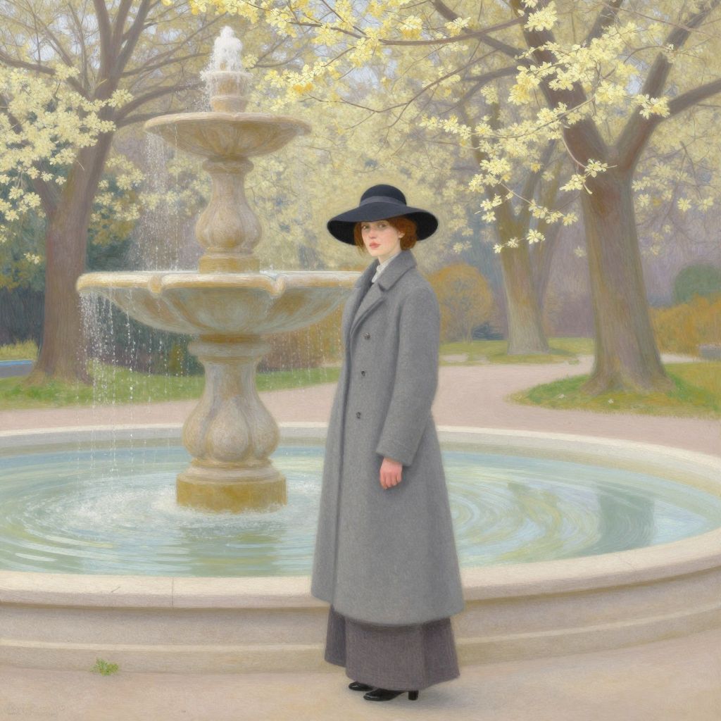 This digital painting depicts a woman standing in front of a circular stone fountain in a park. She wears a long, gray overcoat, a black hat, and a gray skirt that reaches her ankles. Her brown hair is partially visible under the hat. The fountain, centrally located, has a classical design with water gently cascading down. The background features blooming trees with yellow blossoms and a winding path. The scene is bathed in soft, natural light. The woman stands slightly to the right of the fountain, looking to the left with a calm expression. The overall style is realistic with a gentle, serene atmosphere.