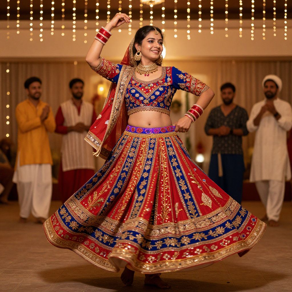Photograph of a smiling Indian woman dancing in a brightly lit room. She wears a traditional red and blue lehenga choli with intricate gold embroidery, matching bangles, and a red dupatta. Her hair is tied back, and she has a gold necklace. The background features four men in traditional Indian attire, standing and watching her. String lights hang from the ceiling, adding a festive glow. The woman's midriff is exposed, and her skirt flares out as she twirls. The scene exudes cultural vibrancy and celebration.