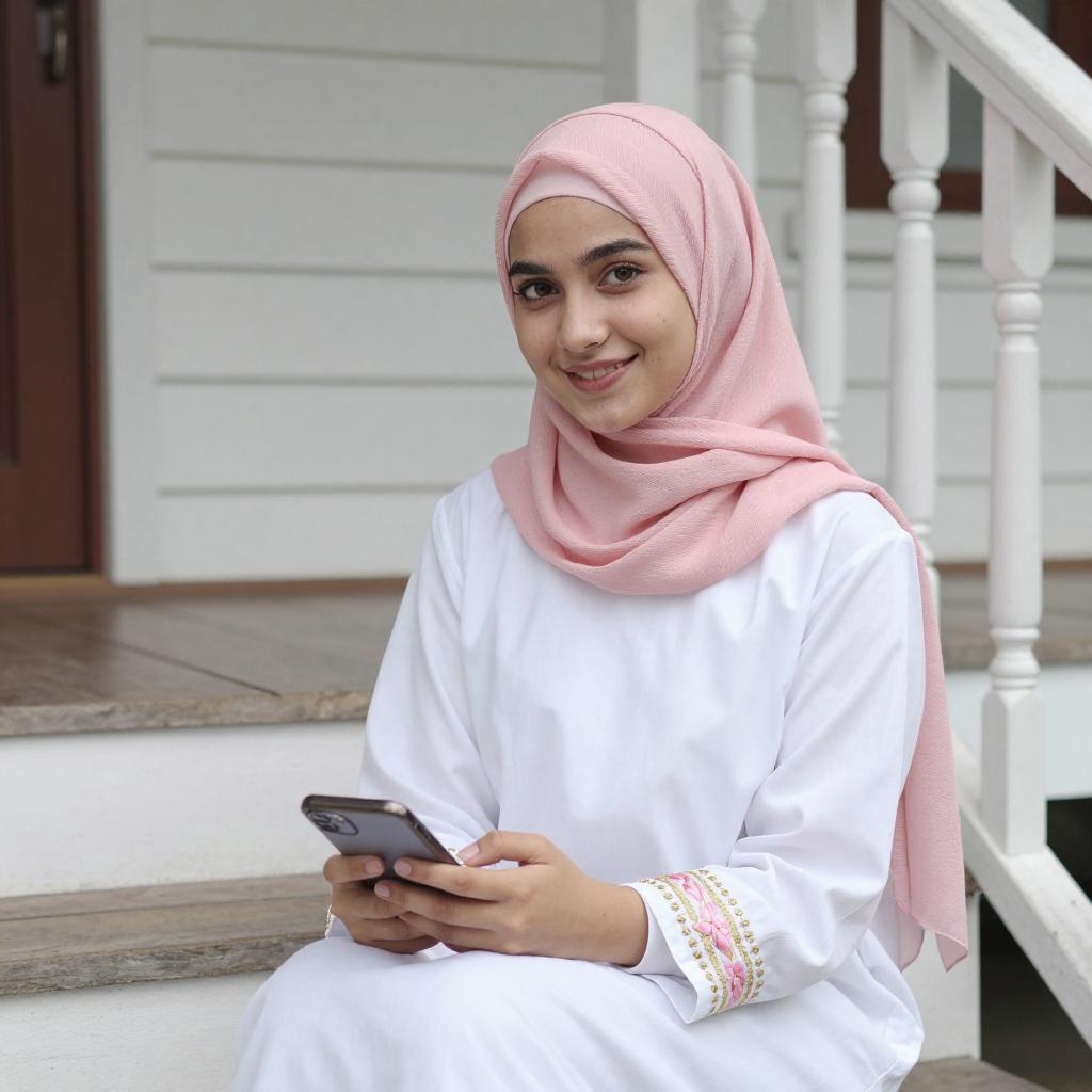 Photograph of a young woman with light skin and brown eyes, wearing a white hijab, pink top, and beige cardigan. She smiles softly, standing in front of green doors with a light switch and wall-mounted device in the background.