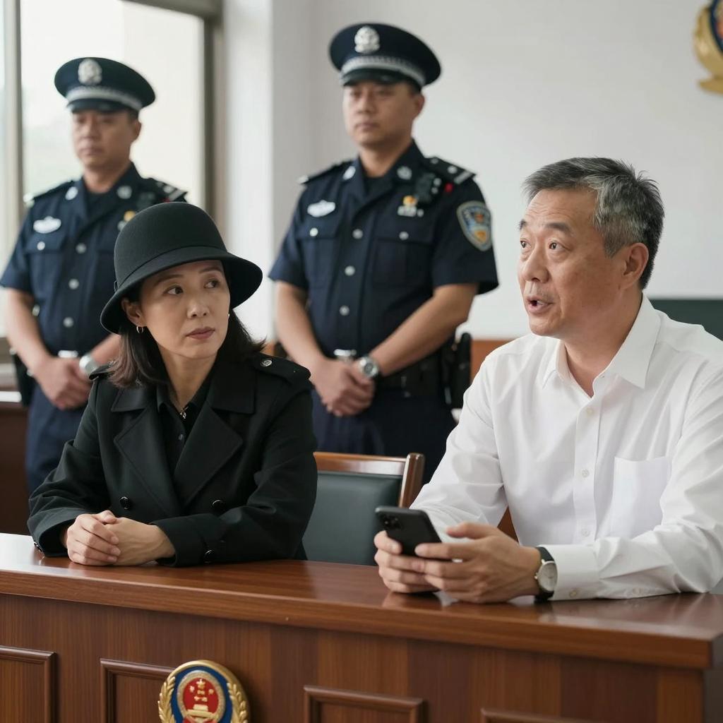 Photograph of a courtroom scene featuring three Asian men in formal suits engaged in an intense discussion. One man is seated wearing a gray suit with a checkered tie, another man is standing with hands in his pockets wearing a dark gray suit and blue tie, and the third man is leaning forward in a navy suit and patterned tie. The background shows wooden courtroom pews with other individuals seated and a judge's bench with a person standing behind it.