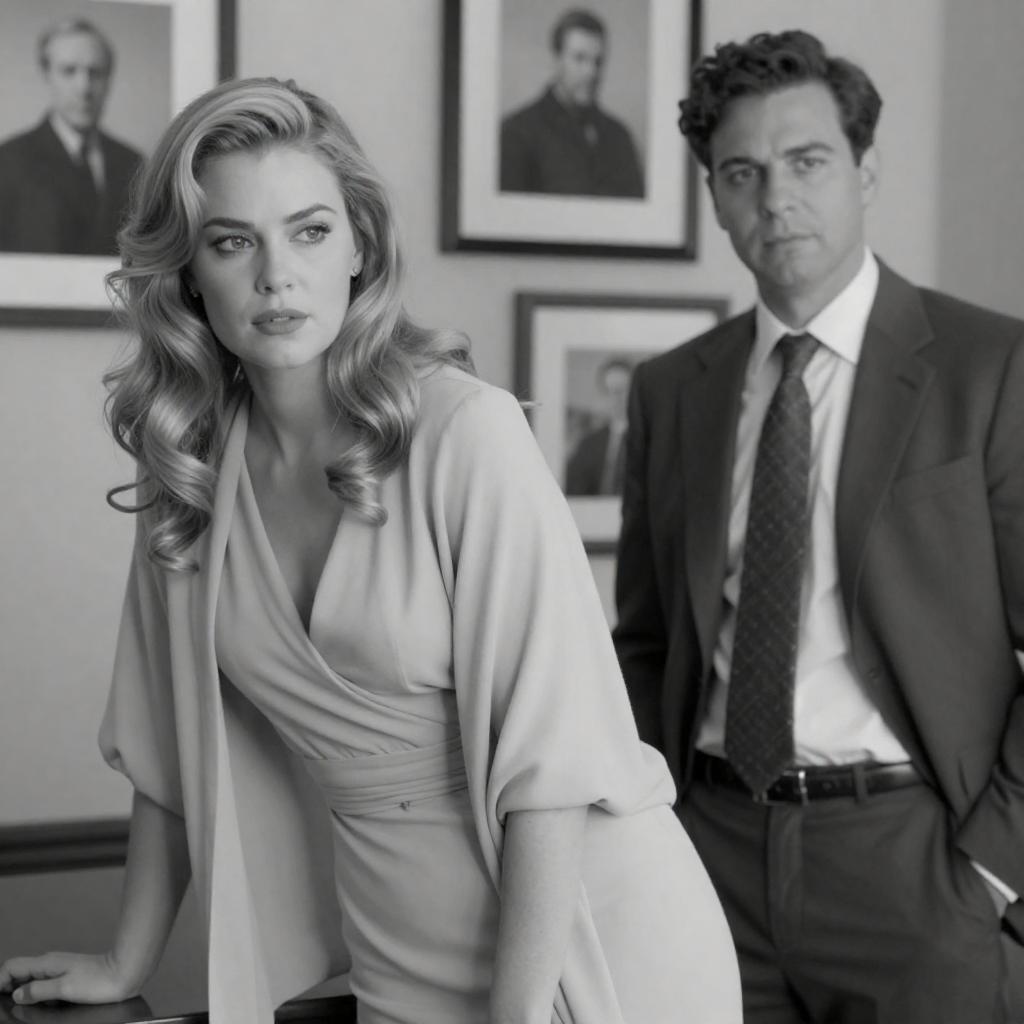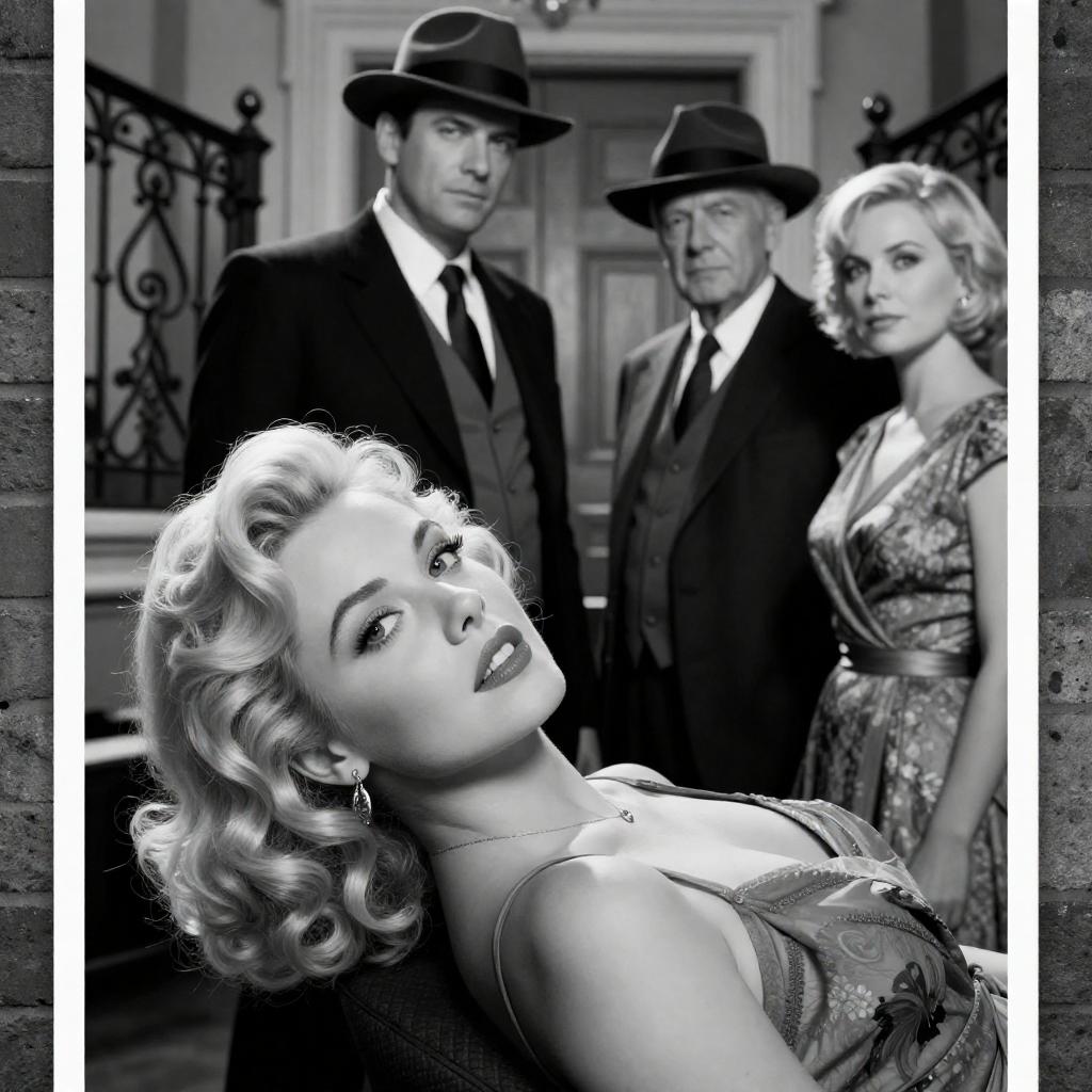 Black and white movie poster with four people. Blonde woman with curled hair, large eyes, and sultry expression reclines. Tall man in suit and hat stands behind her, looking forward. Older man in dark suit and hat stands to the right, looking at her. Blonde woman with short hair and patterned dress stands to the right, looking at the camera. Background features ornate railing and door. Poster has brick border.