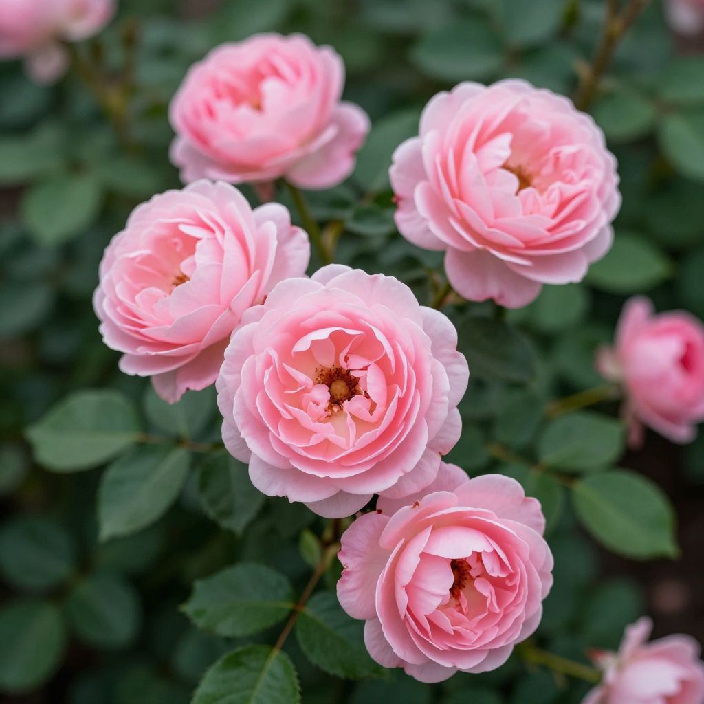 Photograph of five pink rose blossoms in full bloom, with delicate, layered petals in varying shades of pink and white. The central rose is the largest and most prominent, with smaller roses clustered around it. Dark green leaves with a slightly textured surface fill the background, creating a contrasting backdrop that highlights the soft, delicate petals of the roses. The image is sharply focused on the flowers, with a shallow depth of field that blurs the background, drawing attention to the intricate details of the rose petals.