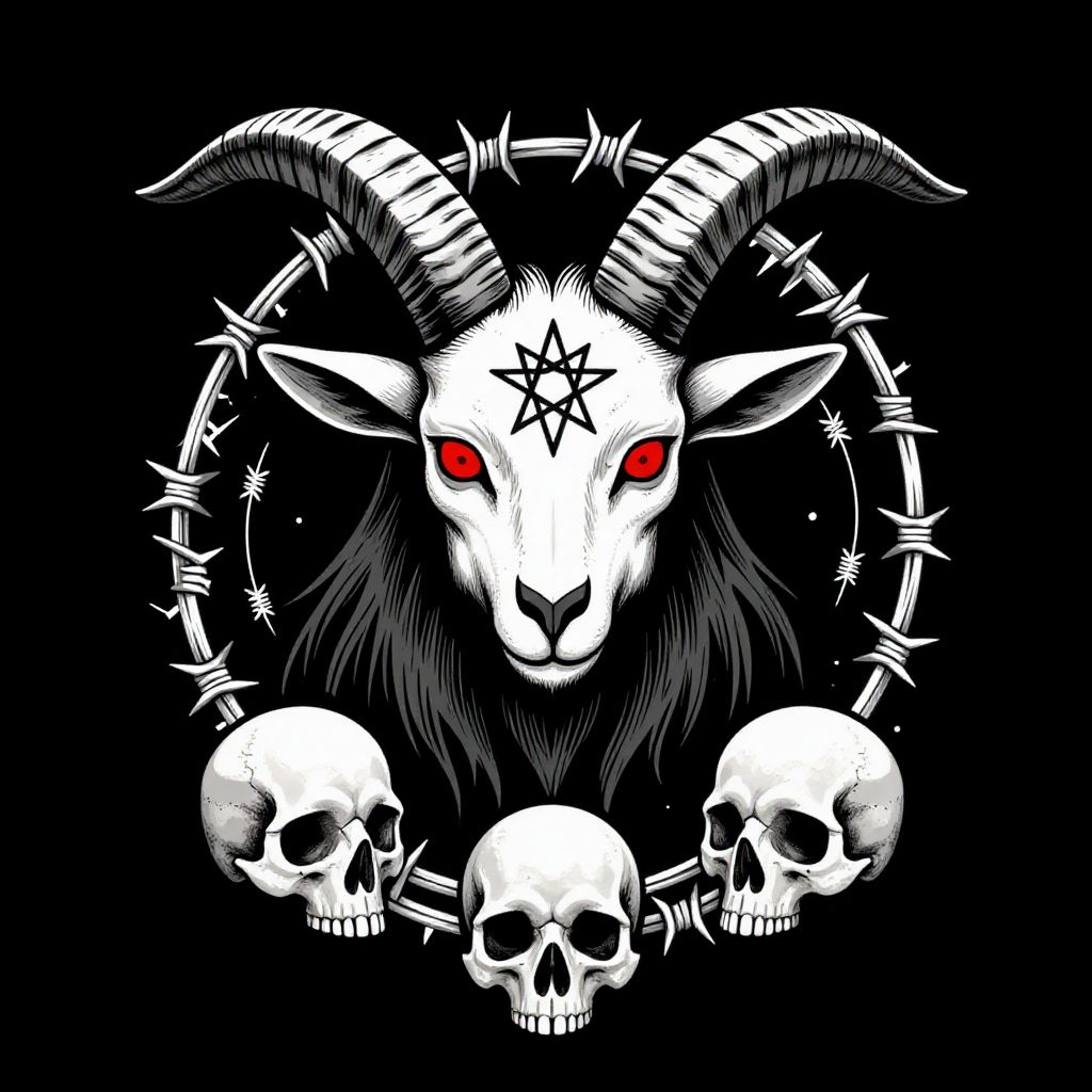 Dark fantasy vector illustration featuring a mythical goat beast with red eyes, long black hair, and large curved horns. The goat's forehead bears a pentagram symbol, surrounded by a circular barbed wire design with thorny elements. Three detailed human skulls are positioned at the base, creating a gothic and occult-themed composition on a black background with striking red accents.