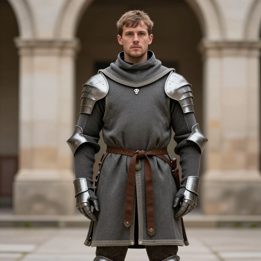 A photograph of a young Caucasian man with short, light brown hair and a slight beard, standing in front of a stone archway. He wears a medieval-style, dark gray wool tunic with silver steel plate armor on the shoulders, forearms, and hands. The tunic is belted with a brown leather strap. His expression is neutral, and he stands with a straight posture. The background features blurred, beige stone arches and a stone-paved ground. The image has a realistic, slightly saturated color style.