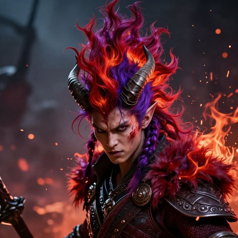 Digital artwork of a fierce, demonic character with vibrant, fiery red and purple hair, and large, curved black horns. Their pale, blood-smeared face is intense, with sharp, pointed ears. They wear ornate, black armor adorned with red fur, and flames erupt from their right shoulder. The background is dark and smoky, with glowing embers. The character's expression is menacing, and their gaze is focused downward. The overall style is fantasy, with a high-contrast, dramatic lighting effect, emphasizing the character's supernatural and aggressive appearance.