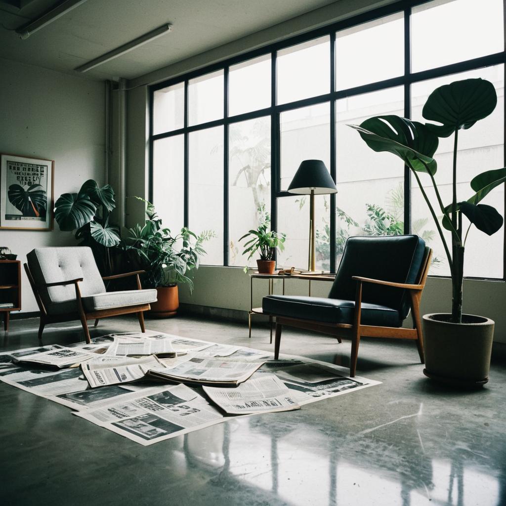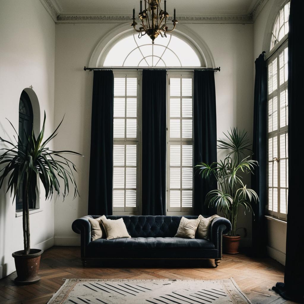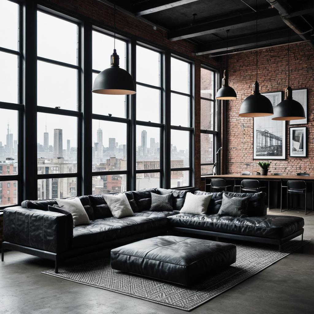 Ultra-realistic industrial loft, exposed brick walls with large metal windows and hanging Edison bulbs, a worn leather sofa with a knitted throw, studio lighting, ar 16:9, photorealistic simplicity.