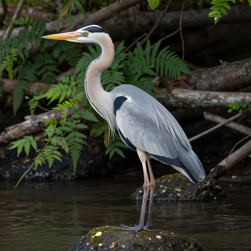 Close-up of a grey heron standing on a moss-covered rock by a river, surrounded by lush green vegetation and tree trunks. The image highlights the elegant bird with its long neck, yellow beak, and detailed feathers in a natural forest stream setting.