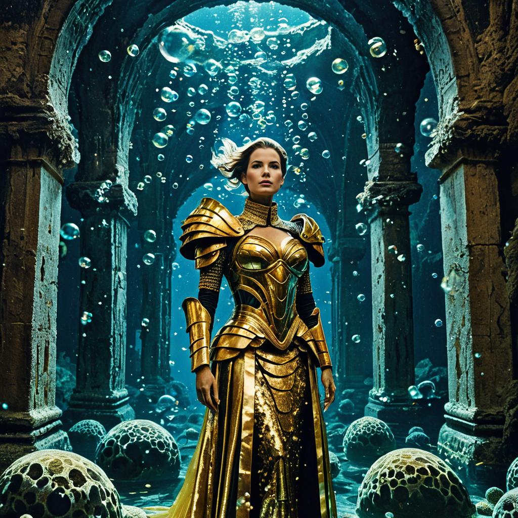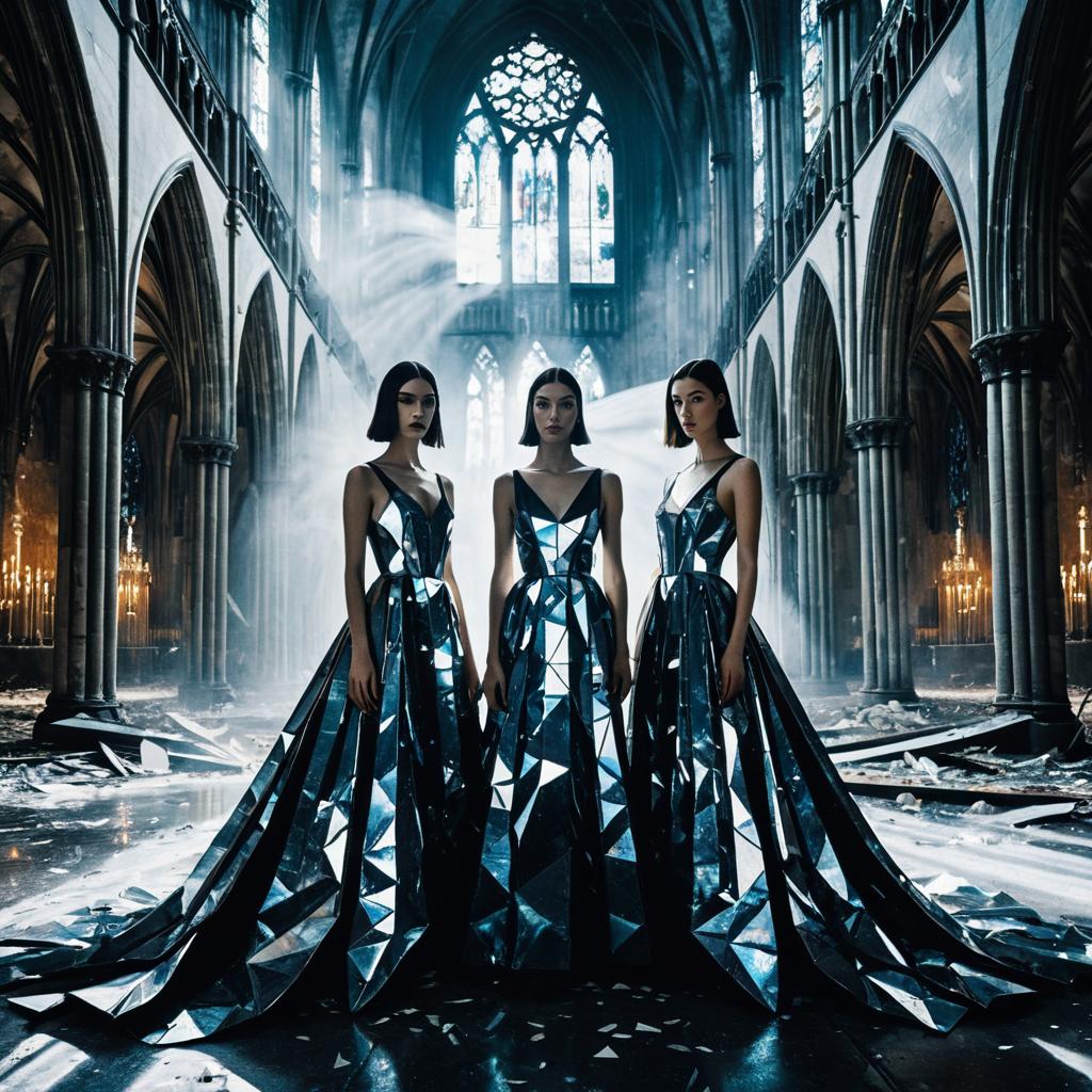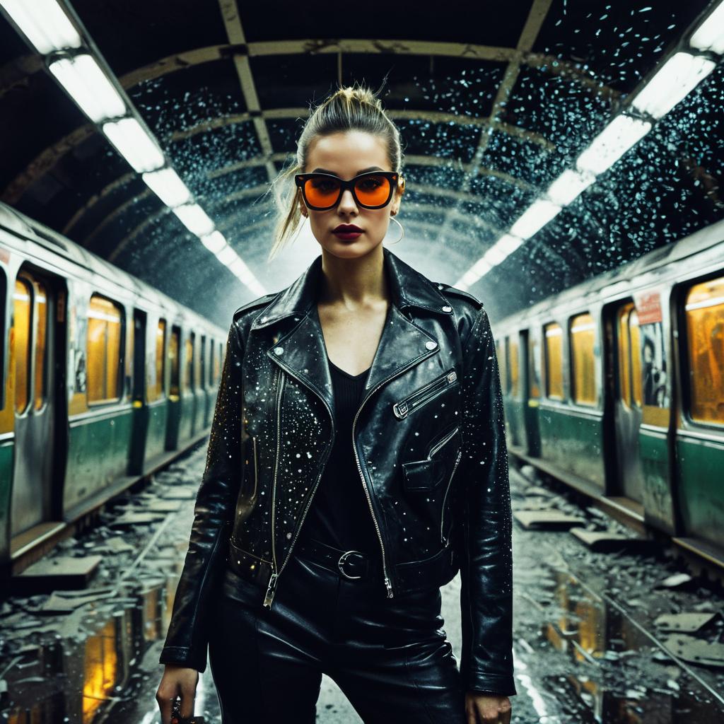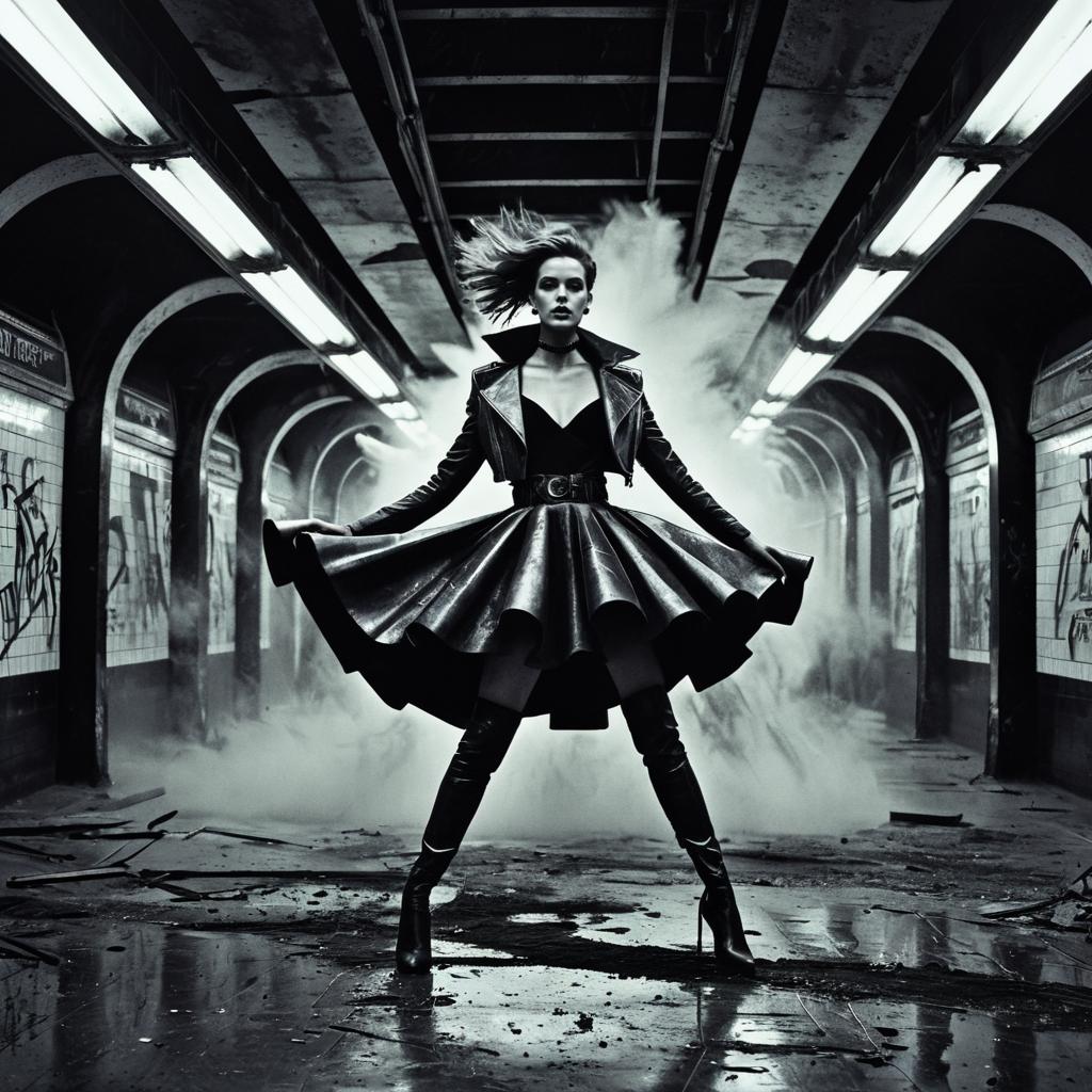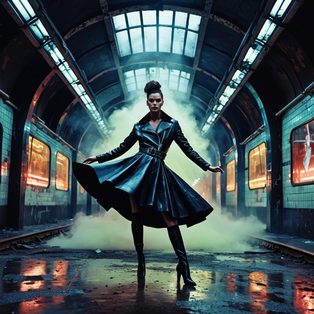 Dramatic high-fashion editorial set in abandoned industrial train yard at twilight, showcasing a striking avant-garde male model wearing angular leather armor, enveloped by drifting dust clouds pierced by sharp shaft of neon light, rendered as an intricate oil painting with multiple exposure, Vogue cover style, cinematic lighting by Stanley Kubrick and Greg Rutkowski.