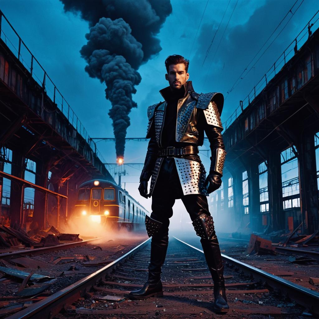 Striking male model dressed in angular studded black leather armor posing confidently on railway tracks in an abandoned industrial train yard at twilight. The background features old rusted trains and dramatic clouds with cinematic lighting. The scene is evocative of a high-fashion editorial with a futuristic, dystopian aesthetic.