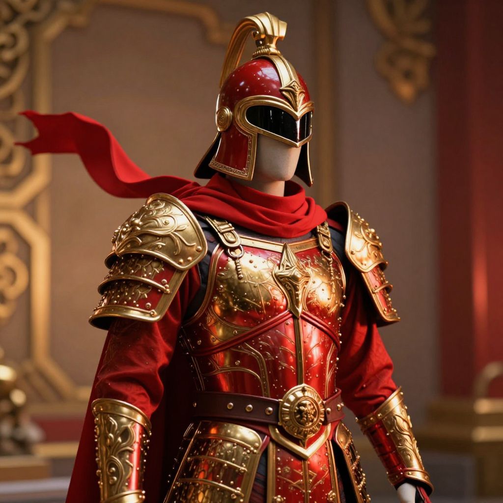 A detailed mannequin wearing a majestic red and gold armor with intricate metal detailing, a prominent helmet with a golden crest and a curved visor, and a flowing red scarf wrapped around its neck, adding a dynamic and regal touch. The mannequin stands upright in a stylized, slightly futuristic setting, illuminated by soft golden and crimson light, giving it a dramatic and vivid appearance. The armor reflects the ambient glow, emphasizing the contrast between the bold red and shining gold tones, while the scarf adds a sense of movement and elegance even in a static form.