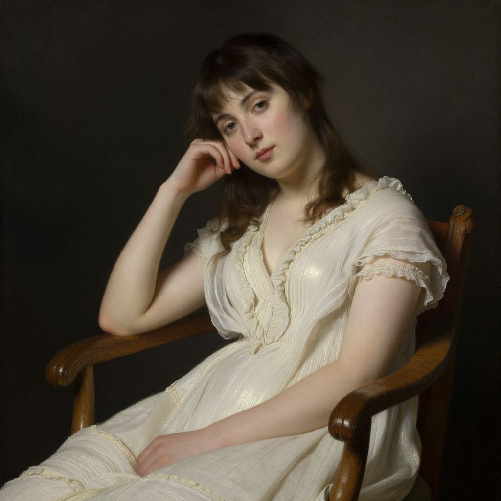 Portrait of a young woman by Adolphe-William Bouguereau, featuring her seated in a wooden chair against a dark background, wearing a cream-colored dress with delicate ruffled details and a soft, contemplative expression.