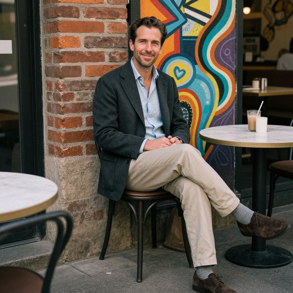 A man, charcoal blazer, beige chinos, pale blue linen shirt, dark brown suede shoes, smart-casual vibe, rustic brick exterior, vibrant street art murals, cozy outdoor café seating, cri film style, relaxed smile, warm ambiance. Man has masculine face and piercing eyes