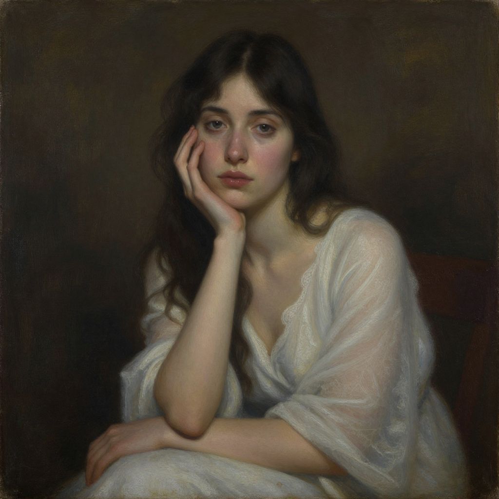 Photorealistic painting of a melancholic woman with long brown hair, pale skin, and closed eyes, resting her head on her hands, wearing a