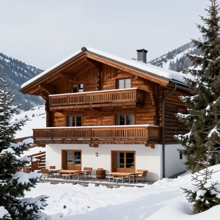 Snow-covered wooden chalet with expansive balconies and a cozy outdoor seating area, nestled amidst evergreen trees in the picturesque Val d'Anniviers, Canton of Valais, offering skiing, nature, and sauna experiences.