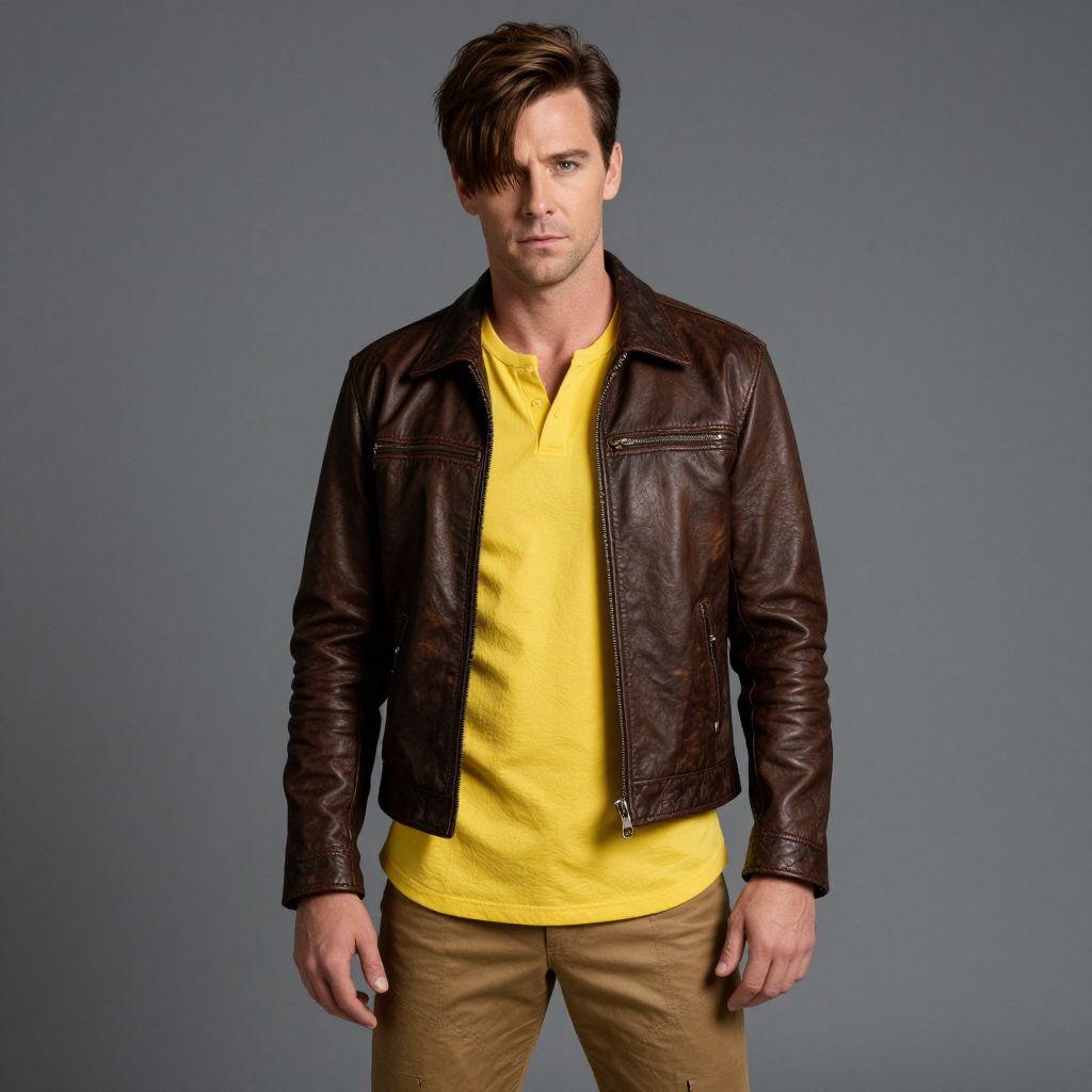 Photograph of a Caucasian man with short, dark brown hair, standing against a plain gray background. He has a serious expression and is wearing a dark brown leather jacket over a bright yellow polo shirt. His beige pants contrast with the jacket and shirt. The leather jacket has a smooth texture, and the polo shirt appears to be made of cotton. His stance is relaxed with his arms slightly away from his body. The lighting is even, highlighting the colors and textures of his clothing.