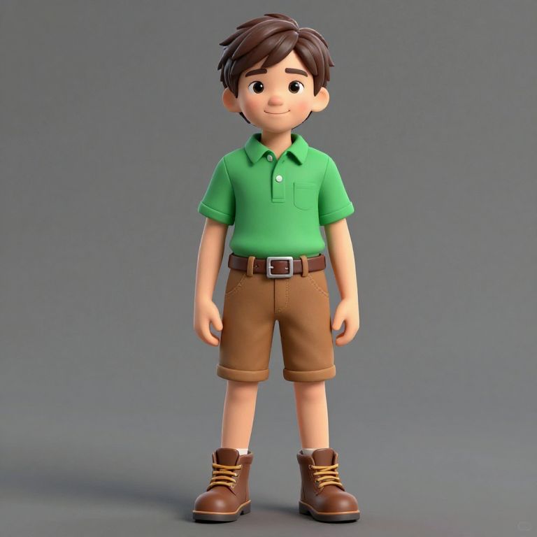 CGI 3D cartoon boy with short brown hair, green polo shirt, brown shorts, brown belt, and boots, standing against gray background.