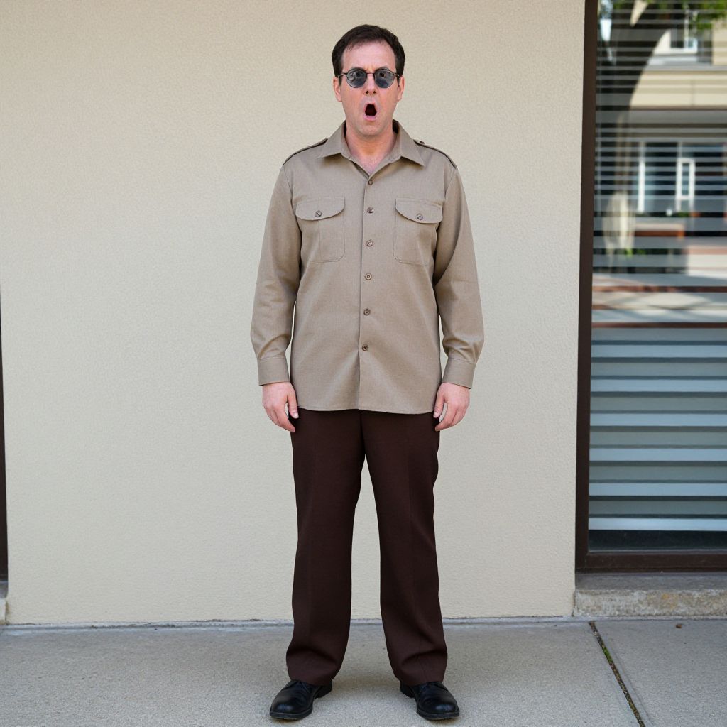 Photograph of a middle-aged man standing in front of a beige wall with a window on the right. He has short dark hair, wears round dark sunglasses, and is dressed in a beige long-sleeve button-up shirt with chest pockets, black pants, and black shoes. His mouth is open in a surprised expression. The background includes a concrete sidewalk and part of a modern building with horizontal blinds. The lighting is bright and even, suggesting daytime. The man's skin tone is light, and his build is average. The image has a slightly exaggerated, comical style.